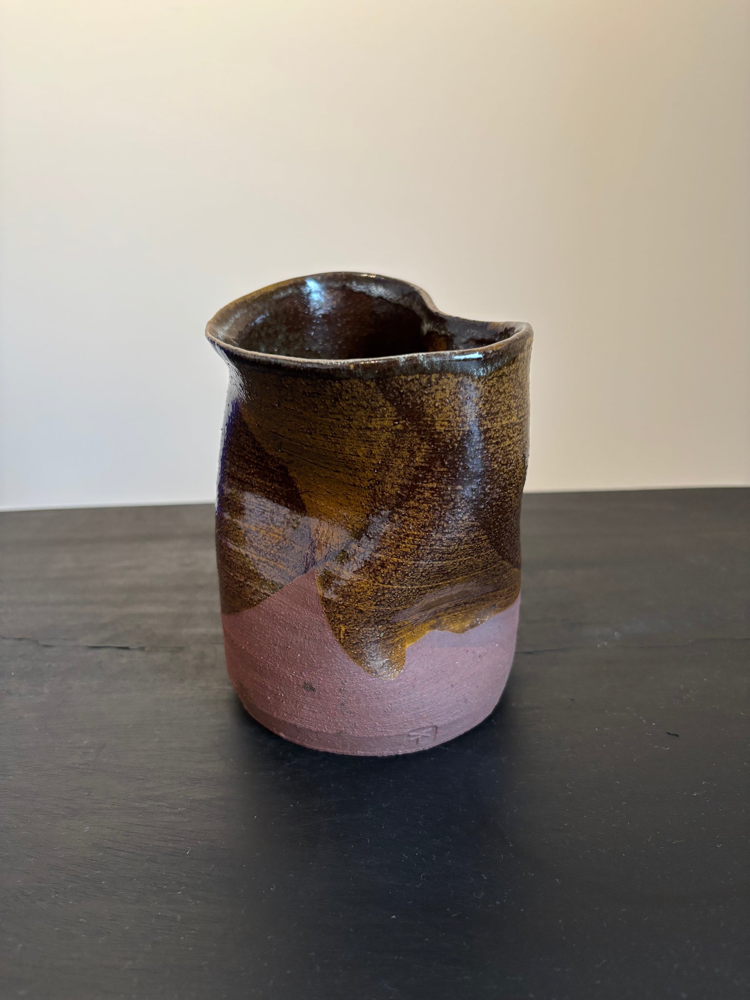 Matte mauve-rose exterior paired with a deep glossy brown rim and interior